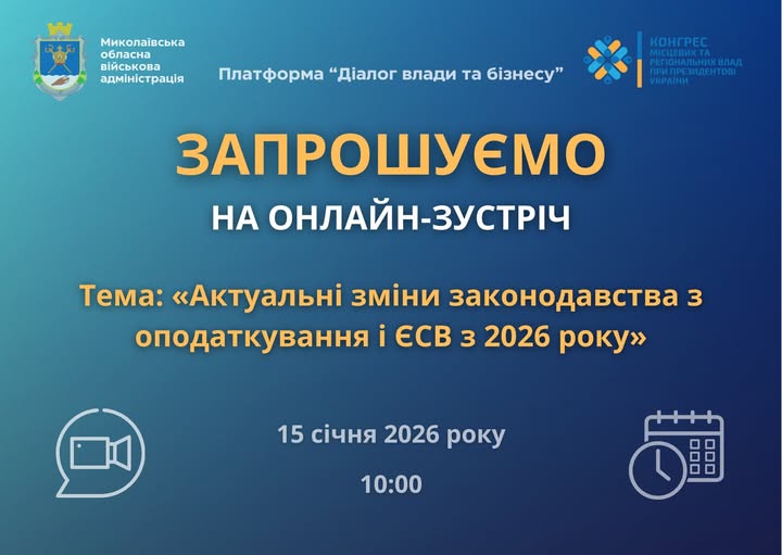 «Діалог влади та бізнесу» триває: запрошуємо представників бізнесу взяти участь в онлайн-зустрічі на тему: «Актуальні зміни законодавства з оподаткування і ЄСВ з 2026 року»