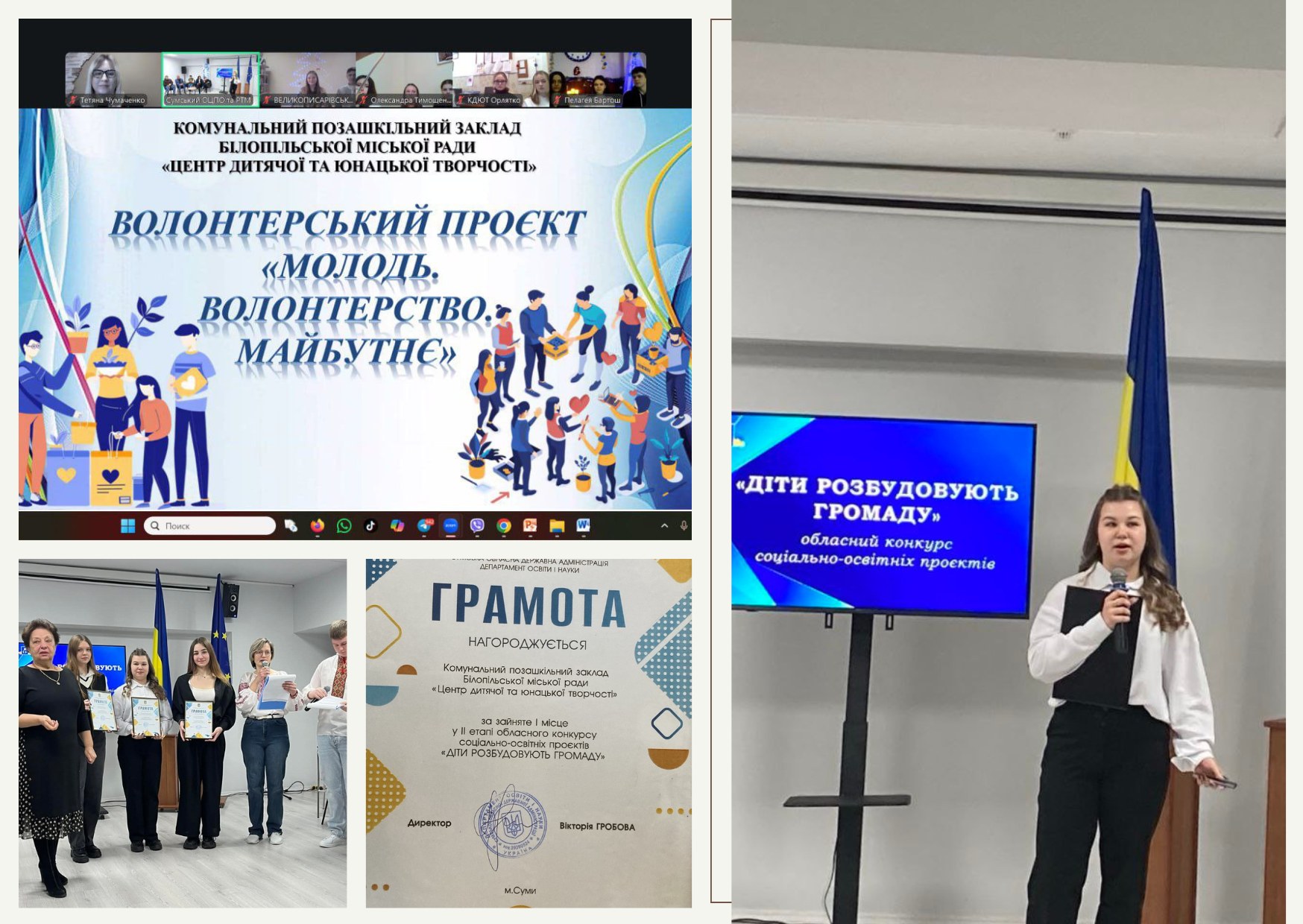 Наші вихованці, лідери учнівського самоврядування, – Маргарита ГОСТЕВА, учениця Білопільського ліцею №1, Нікіта САВІН, учень Білопільської гімназії №4, Ольга ДЕГТЯРЕНКО та Дар’я КАПІТОНОВА, учениці Білопільського ліцею №2 імені С. М. Гордієнка, разом з освітянською спільнотою громади, працювали над реалізацією волонтерського проєкту «Молодь. Волонтерство. Майбутнє».