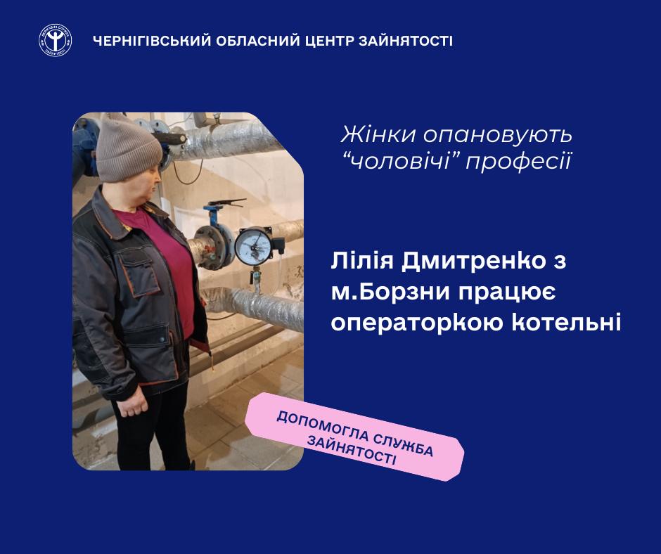 🔸 Жінка за освітою перукарка, проте 8 років пропрацювала кондитеркою на фабриці печива. Також була контролеркою енергонагляду, кухаркою, плела маскувальні сітки на суспільно корисних роботах. Останнім часом працювала диспетчером на ВПТМ «Борзнатеплокомуненерго», а тепер працює на цьому ж підприємстві за здобутою професією. Каже, що почувається «на своєму місці» й справляється не гірше за чоловіків.