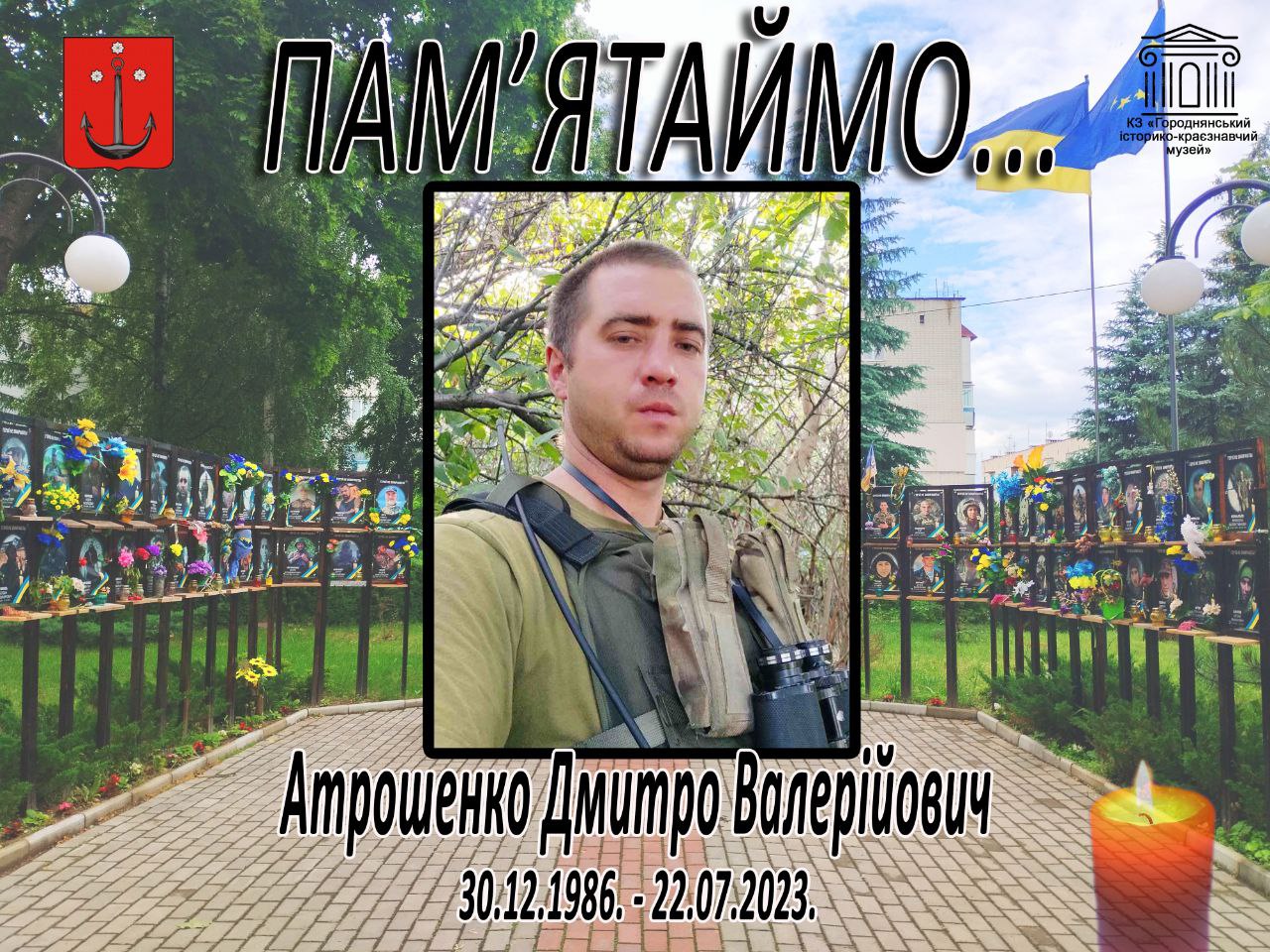 Старший солдат Дмитро Атрошенко, позивний «Димазда», загинув 22 липня 2023 року на Луганщині. Виконуючи службові обов’язки із захисту України, отримав смертельне поранення під час артилерійського обстрілу з боку окупантів.