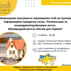 Запрошуємо внутрішньо переміщених осіб на групову інформаційно-юридичну сесію,-“Компенсація за пошкодженезруйноване житло. Міжнародний реєстр збитків для України”