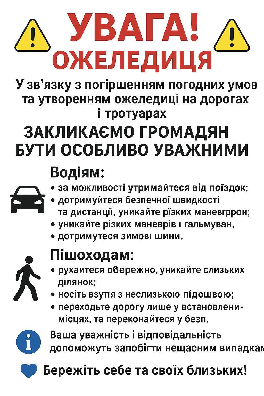 У зв’язку з погіршенням погодних умов та утворенням ожеледиці на автошляхах і тротуарах, закликаємо вас бути особливо уважними та відповідальними задля збереження життя і здоров’я.