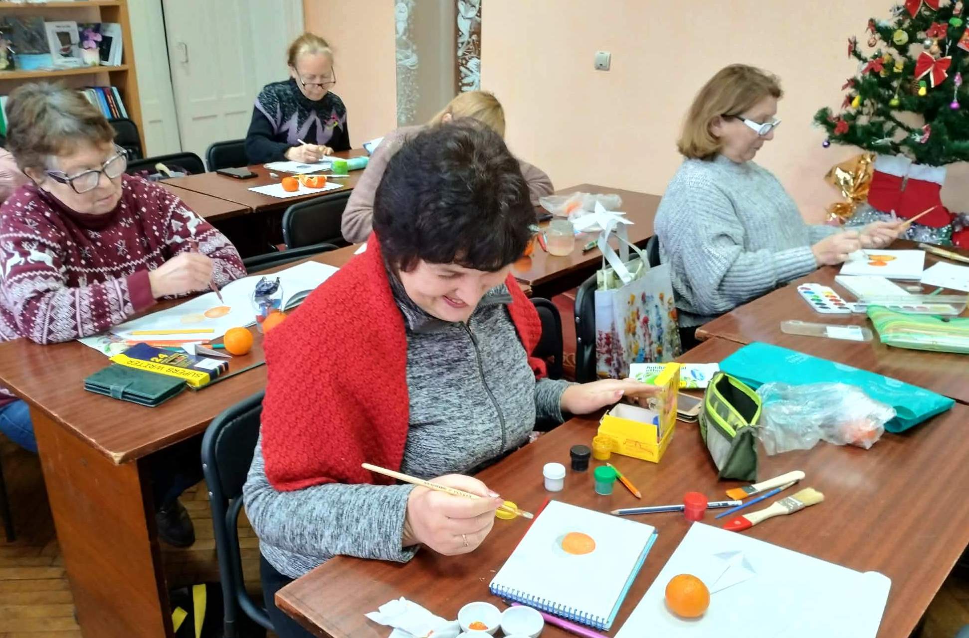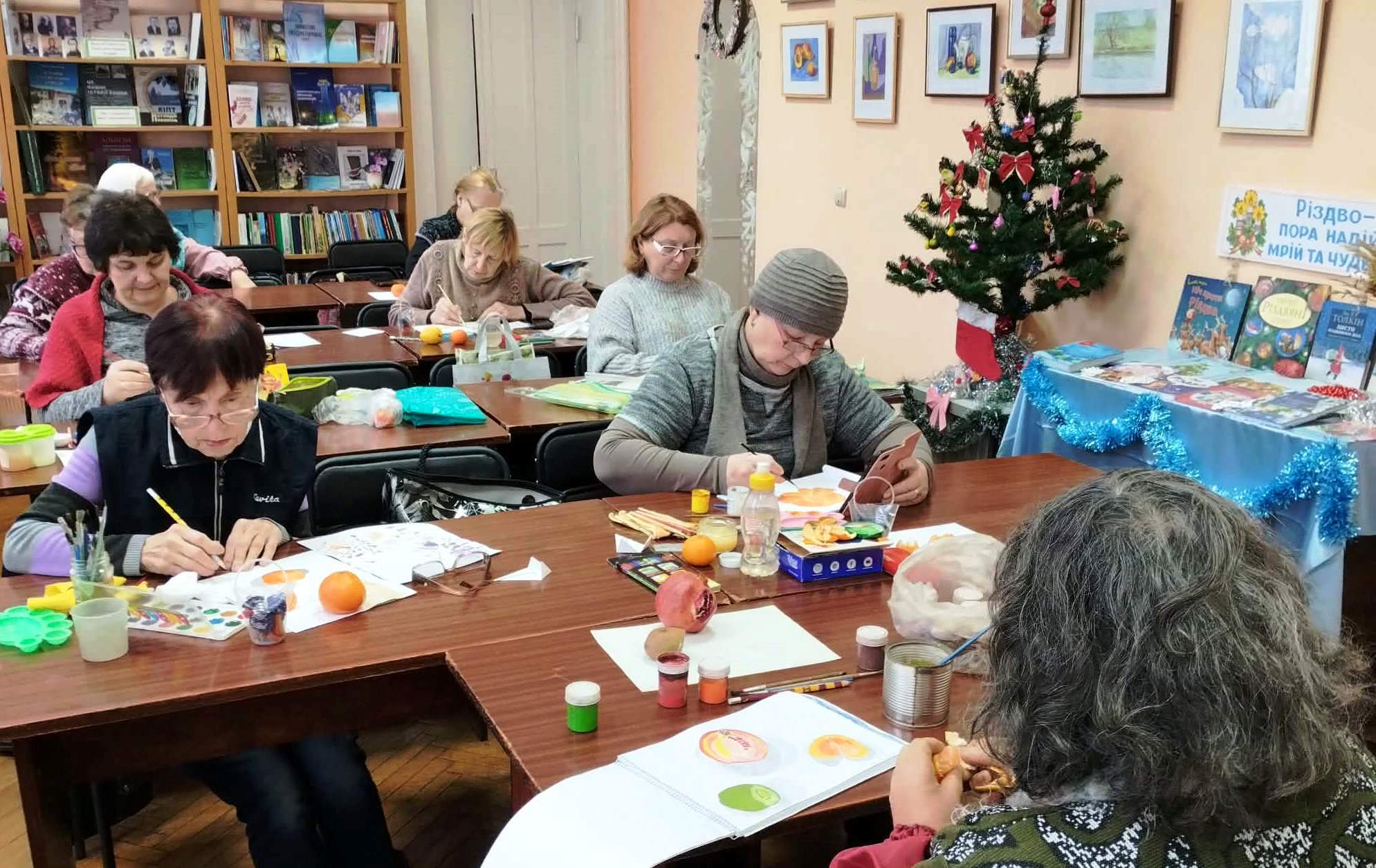 У читальній залі закладу панувала особлива атмосфера: простір наповнився свіжим ароматом цитрусових, який ненав’язливо підказував художницям кольорові рішення та формував настрій заходу, відчувалося передчуття прийдешніх різдвяно-новорічних свят.