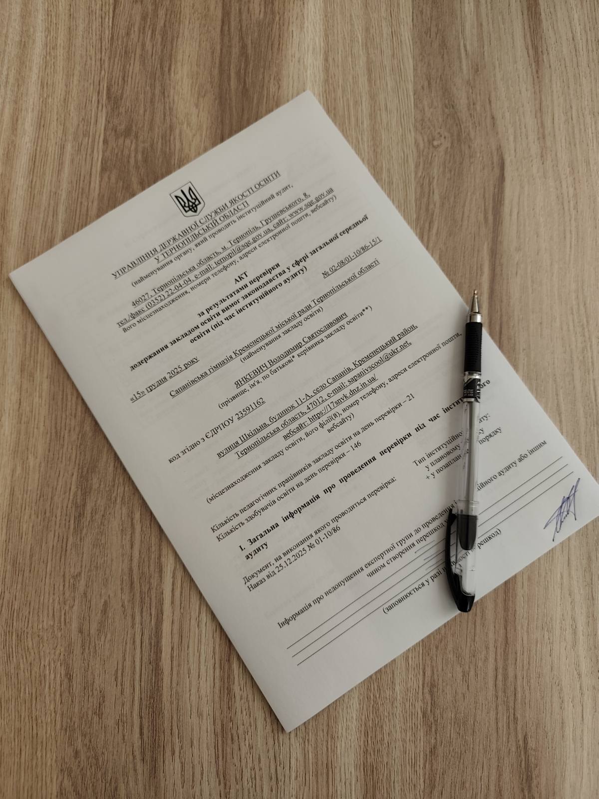 Завершення позапланового інституційного аудиту Сапанівської гімназії Кременецької міської ради відбулося підписанням Акта за результатами перевірки додержання закладом освіти вимог законодавства у сфері загальної середньої та обговоренням проблемних питань з удосконалення освітніх та управлінських процесів.