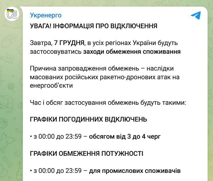 За інформацією «Укренерго», електропостачання відключатимуть упродовж дня, у 3–4 чергах майже по всій країні.
