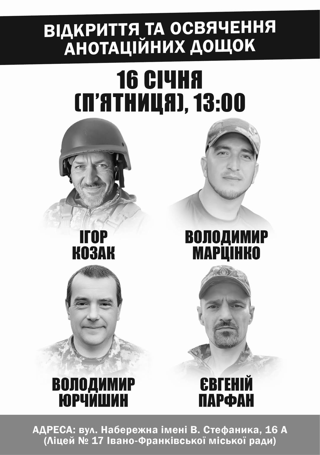 Завтра, 16 січня 2026 року, на фасаді Ліцею 17 Івано-Франківської міської ради відбудеться відкриття анотаційних дощок загиблим захисникам України: Ігорю Козаку, Володимиру Марцінко, Володимиру Юрчишину та Євгенію Парфану.
