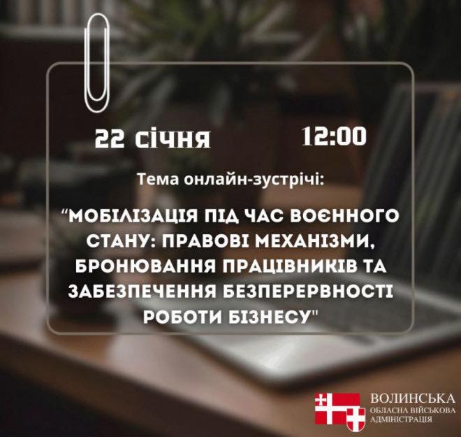 ▪️ Тема зустрічі: «Мобілізація під час воєнного стану: правові механізми, бронювання працівників та забезпечення безперервності роботи бізнесу»