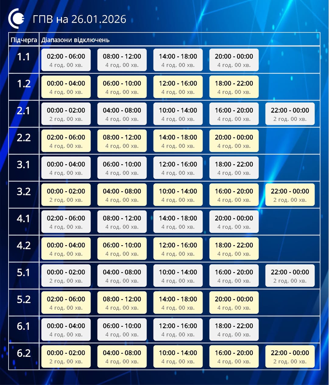 Завтра, 26 січня, діятимуть графіки погодинних відключень відповідно до обсягів, доведених командою з НЕК “Укренерго”.