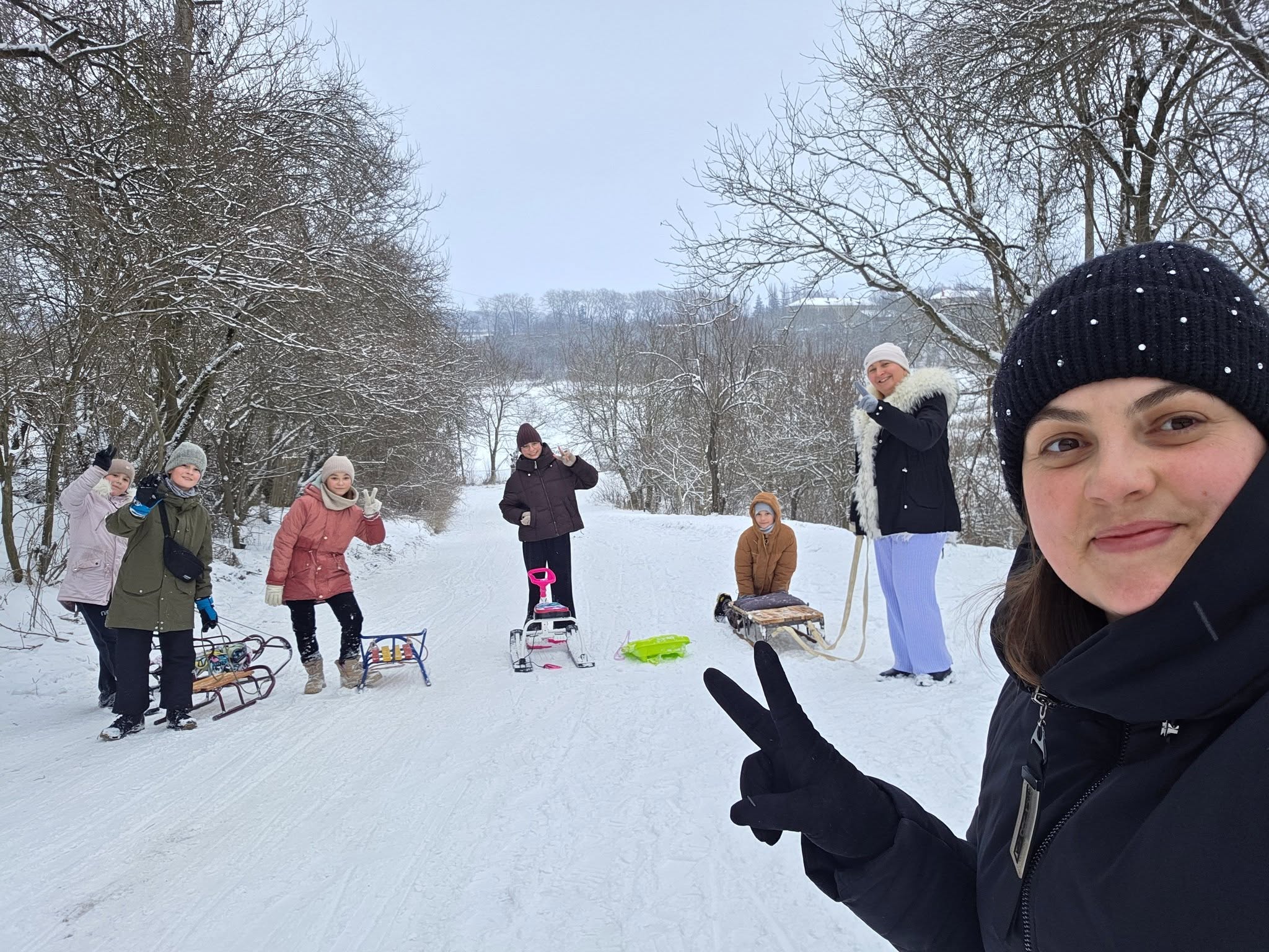 Санчата об’єднали всіх: каталися бібліотекарі, вчителі, наші користувачі та просто місцеві дітлахи. Нас було небагато, зате сміху й радості — на всіх вистачило 😊