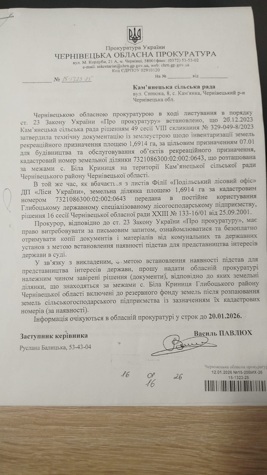 Краще вже читайте статті журналістів. Я неодноразово публікувала рішення Чернівецької обласної ради 2000, 01, 03 років і наголошувала, що обласна рада не передавала новоствореним лісгоспам АПК окремі ділянки, тим більше з кадастровими номерами. Передавали земельні масиви в загальних цифрах гектарів (причому в кожному рішенні — різні цифри у бік зменшення, землі десь «розчинялися») без будь-якої ідентифікації навіть за місцем їх розташування (див прикріплений файл). Тому земельна ділянка у 1,6914 га з зазначеним у прокурорському листі кадастровим номером (присвоєним, до речі, завдяки Кам’янецькій сільраді) ніяк не могла бути передана рішенням облради у 2001 році Глибоцькому держспецлісгоспу. Це фантазії Василя Гончара, які наші прокурори, курам на сміх, сприймають за чисту монету.