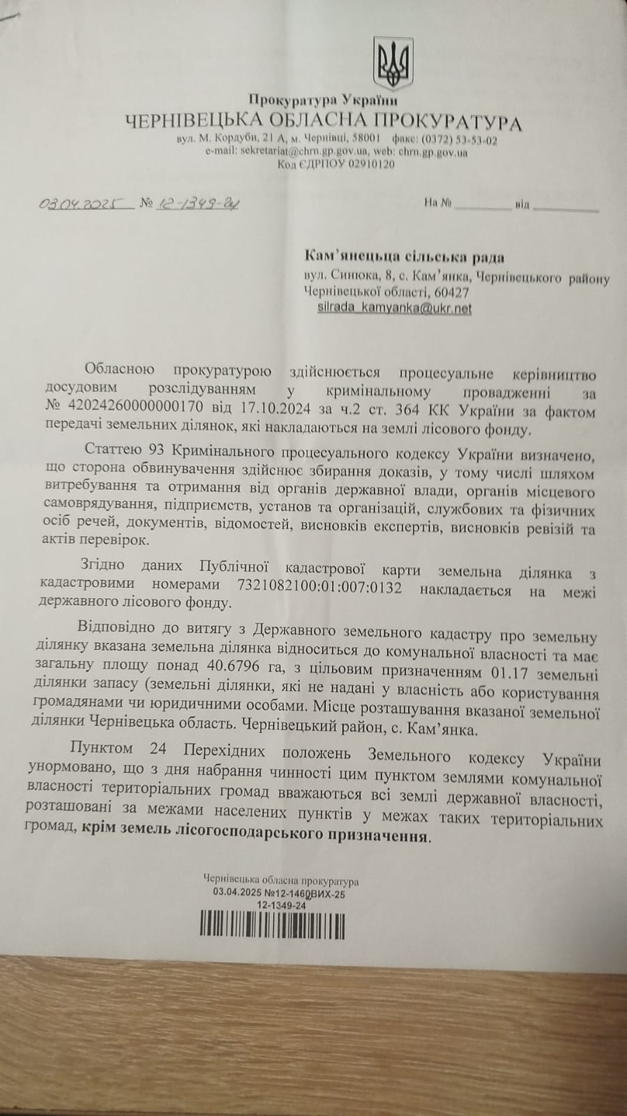 У грудні 2024 року слідче управління ГУ Нацполіції в Чернівецькій області разом з обласним управлінням стратегічних розслідувань відкривають і розслідують проти посадових осіб Кам’янецької сільради кримінальну справу за ознаками зловживання владою, яке, бач, спричинило тяжкі наслідки (див. прикріплений файл). При цьому вони навіть не розуміють, дії якої громади розслідують — Кам’янецької чи Великокучурівської?