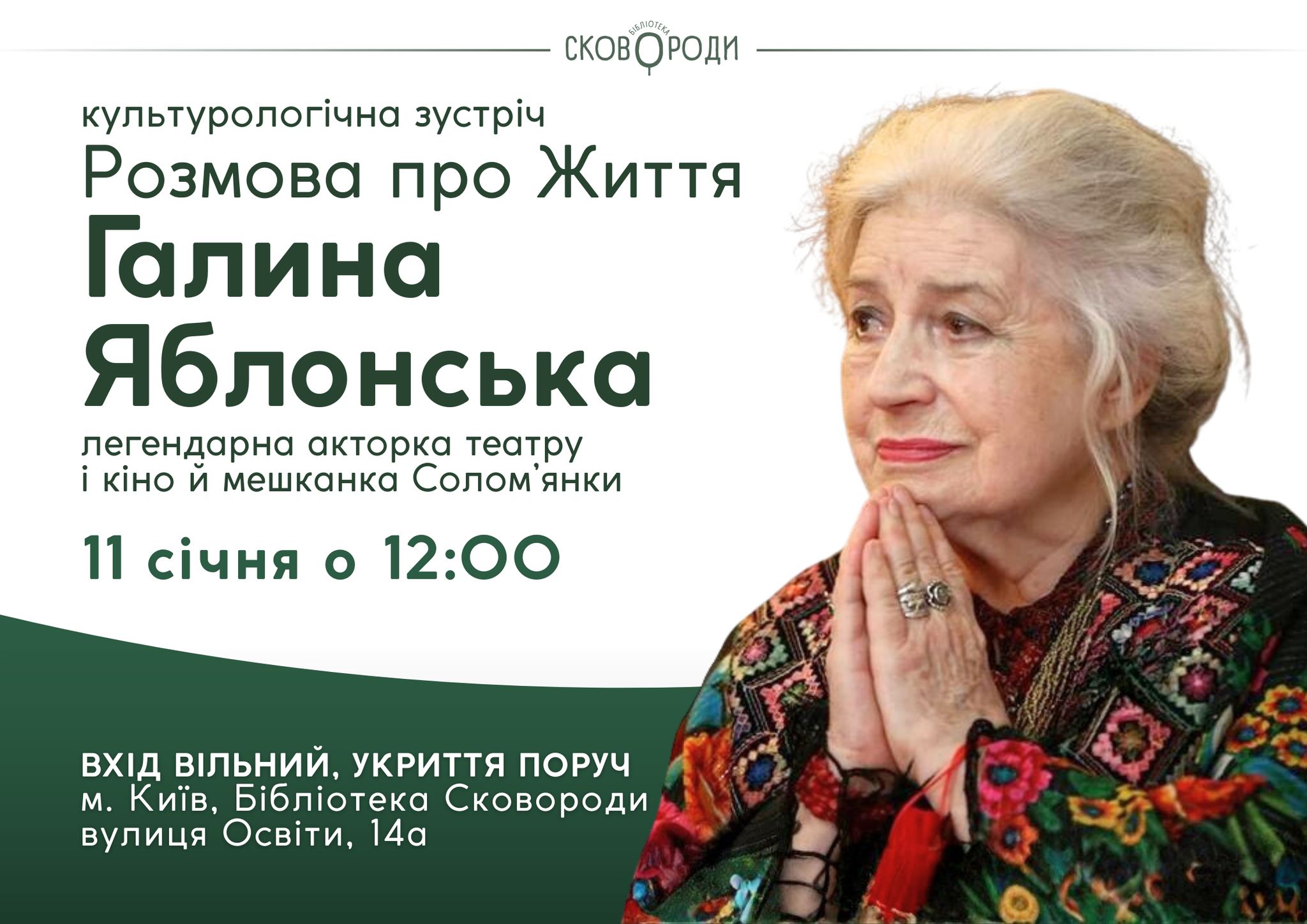🇺🇦 Запрошуємо вас 11 січня, о 12:00, до Центральна бібліотека Солом’янки імені Григорія Сковороди на зустріч “Розмова про Життя” – із легендарною українкою, акторкою театру і кіно й мешканкою Солом’янки Галиною Яблонською (Halyna Yablonska)!