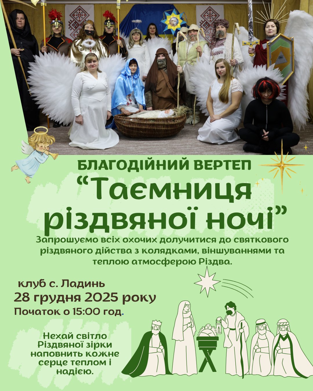 🎭 28 грудня у с. Ладинь та с. Мосир на вас чекає святкове різдвяне дійство — зворушлива історія про народження Спасителя 🙏, боротьбу добра зі злом ⚔️, наповнена колядками 🎶 та щирими різдвяними побажаннями 💛