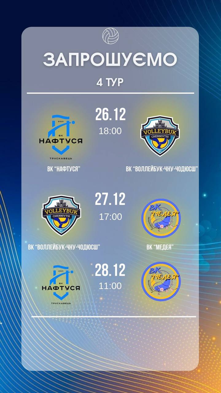 У останні вихідні 2025 року (26-28 грудня) у Трускавці пройде IV тур Чемпіонату України з волейболу (Вища ліга).