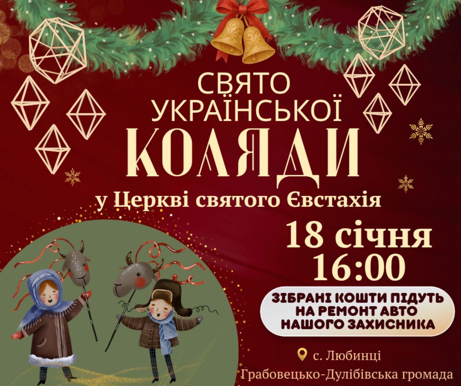У програмі: українські колядки, святкова атмосфера та спільна молитва за мир і Перемогу. Захід має благодійну мету – зібрані кошти будуть спрямовані на ремонт авто нашого Захисника.