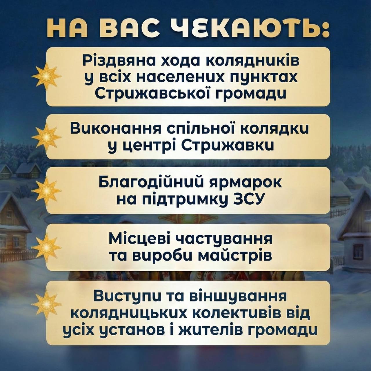 🎵 У межах фестивалю жителі громади матимуть унікальну нагоду почути п’ять старовинних колядок, що були в місцевому побуті. Усіх охочих запрошують долучитися до різдвяного дійства, виходити назустріч колядникам і підтримувати їх теплим словом.