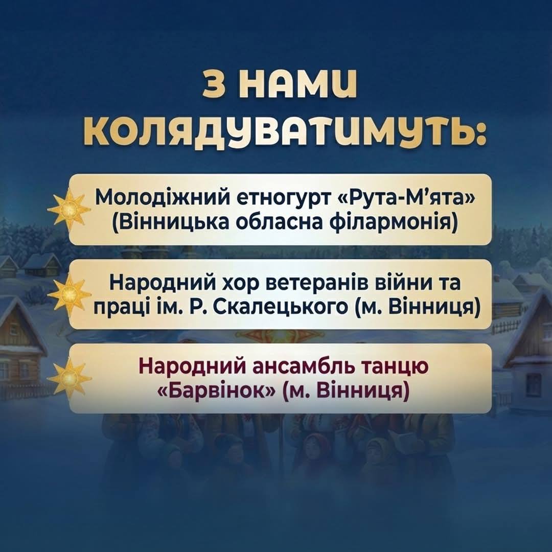 Цього Різдва громада збиратиметься разом, щоб через живу українську традицію підтримати одне одного у складний для країни час. Творчі колективи пройдуть вулицями громади, виконуючи старовинні колядки так, як це робили покоління до нас — щиро, наживо, від серця.