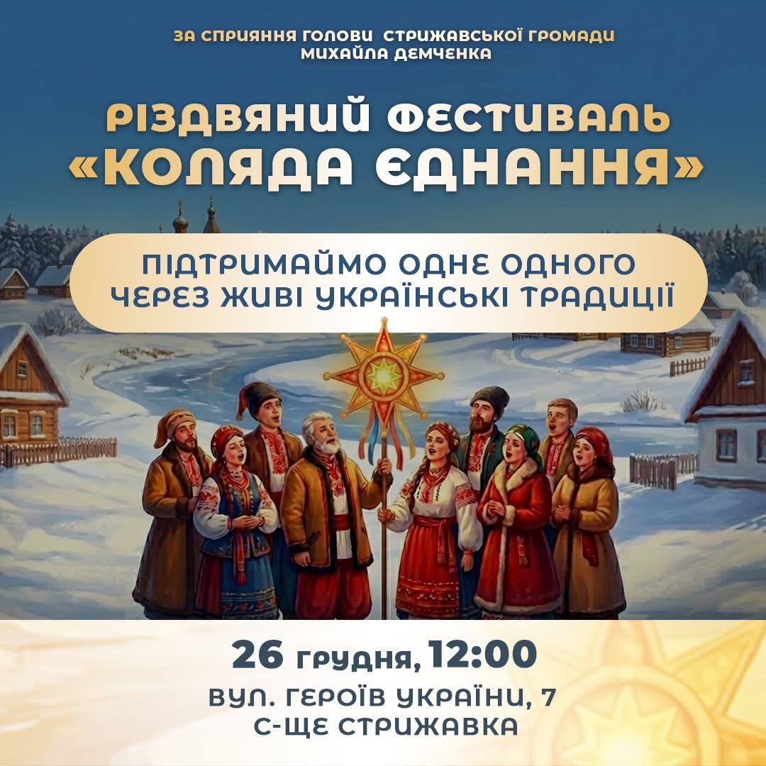 26 грудня, у п’ятницю, о 12:00, в селищі Стрижавка по вулиці Героїв України, 7 відбудеться різдвяний фестиваль «Коляда Єднання».