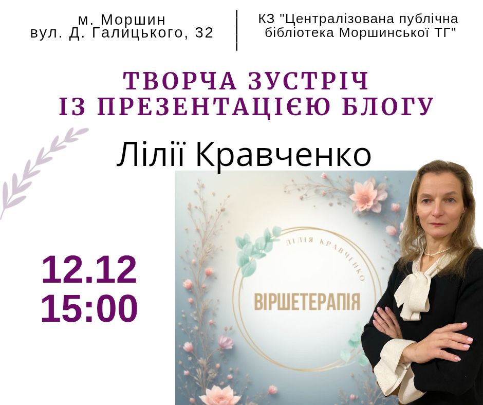 🖋️📖Запрошуємо на творчу зустріч із поетесою – Liliya Kravchenko, яка презентуватиме свій блог “ВІРШЕТЕРАПІЯ”.