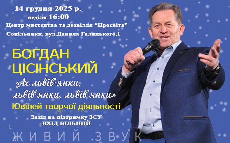 Запрошуємо 14 грудня о 16.00. В Центр мистецч та дозвілля ” Просвіта” на благодійний концерт Богдана Цісінського! Захід на підтримку ЗСУ.. Живий звук!