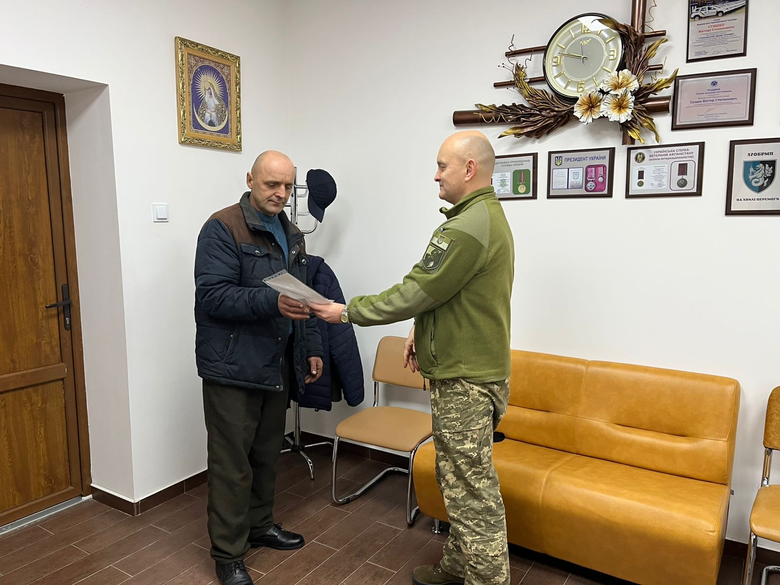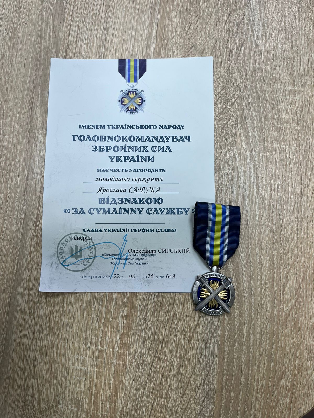 💙💛 За особисту мужність, відвагу та успішне виконання бойових завдань представник Першого відділу Ковельського РТЦК та СП разом із сільським головою Віктором СУЩИКОМ вручили відзнаку від Головнокомандувача ЗСУ «За сумлінну службу» – Сачуку Ярославу Миколайовичу, жителю села Радехів.