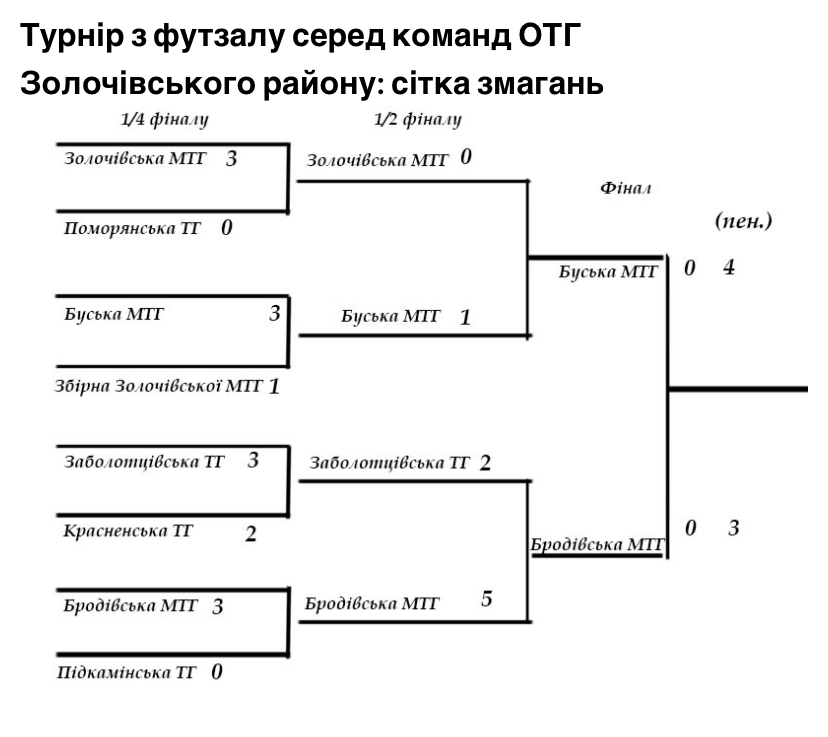 🥅 У вирішальному матчі за перше місце зійшлися у двобої команди Буської МТГ та Бродівської МТГ. Основний час не виявив переможця — 0:0, тож долю переможця турніру вирішувала серія післяматчевих пенальті. У ній більш влучними були футзалісти Буської МТГ, які здобули перемогу з рахунком 4:3.