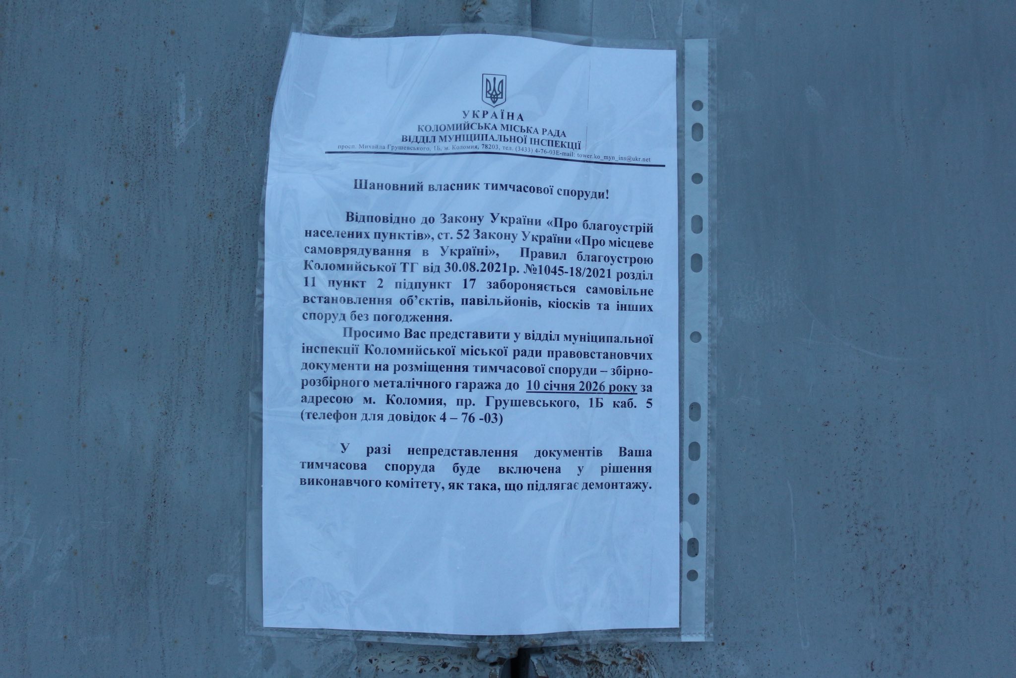 Просимо власників двох металевих збірно-розбірних гаражів на вулиці Гнатюка подати документи, які надають право на розміщення гаражів на зазначеній вулиці. Підтверджуючі документи просимо подати до відділу муніципальної інспекції Коломийської міської ради (пр. Грушевського, 1Б каб. 5).