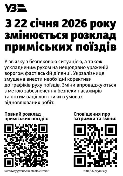Зміна графіка руху приміських поїздів з 22.01.2026