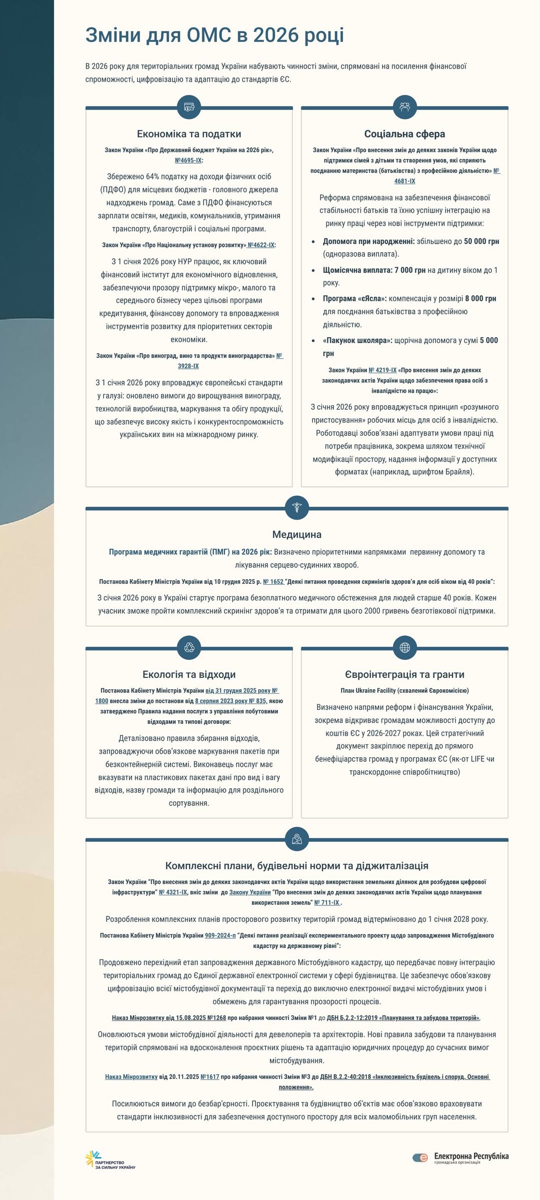 У межах ініціативи «Розбудова економічної стійкості громад прикордонних та прифронтових територій» експерти ГО «Електронна республіка» за підтримки Програми «Партнерство за сильну Україну» зібрали інформацію та розробили інфографіку щодо зміни для ОМС в 2026 році. Матеріал містить огляд ключових змін, що набудуть чинності у 2026 році.