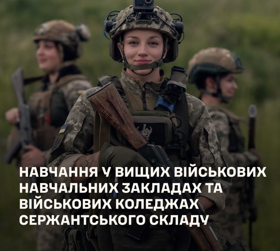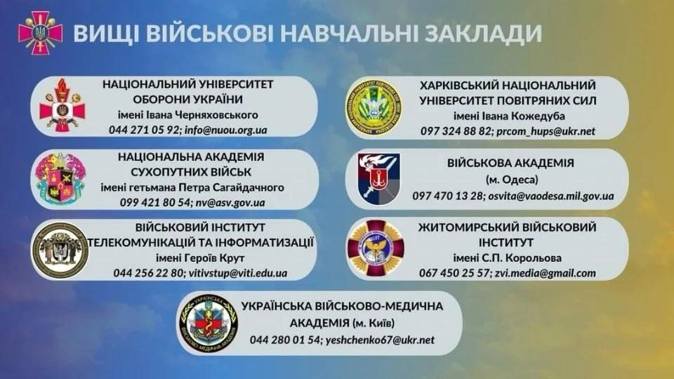 У сучасних умовах захист незалежності та територіальної цілісності України є почесним обов’язком кожного громадянина. Вищі військові навчальні заклади України надають молоді унікальну можливість здобути якісну освіту, стати висококваліфікованими офіцерами та зробити вагомий внесок у безпеку нашої держави. Навчання у вищих військових навчальних закладах поєднує здобуття вищої освіти з формуванням лідерських якостей, дисципліни, відповідальності та патріотизму. Курсанти забезпечуються безкоштовним навчанням, проживанням, харчуванням, форменим одягом і грошовим забезпеченням, а після завершення навчання — гарантованим працевлаштуванням у Збройних Силах України. Запрошуємо юнаків та дівчат, які мають добрий стан здоров’я, бажання служити Україні та прагнуть професійного розвитку, розглянути можливість вступу до вищих військових навчальних закладів. Додаткову інформацію щодо умов вступу, спеціальностей та порядку відбору можна отримати у відповідних територіальних центрах комплектування та соціальної підтримки або на офіційних ресурсах Міністерства оборони України.