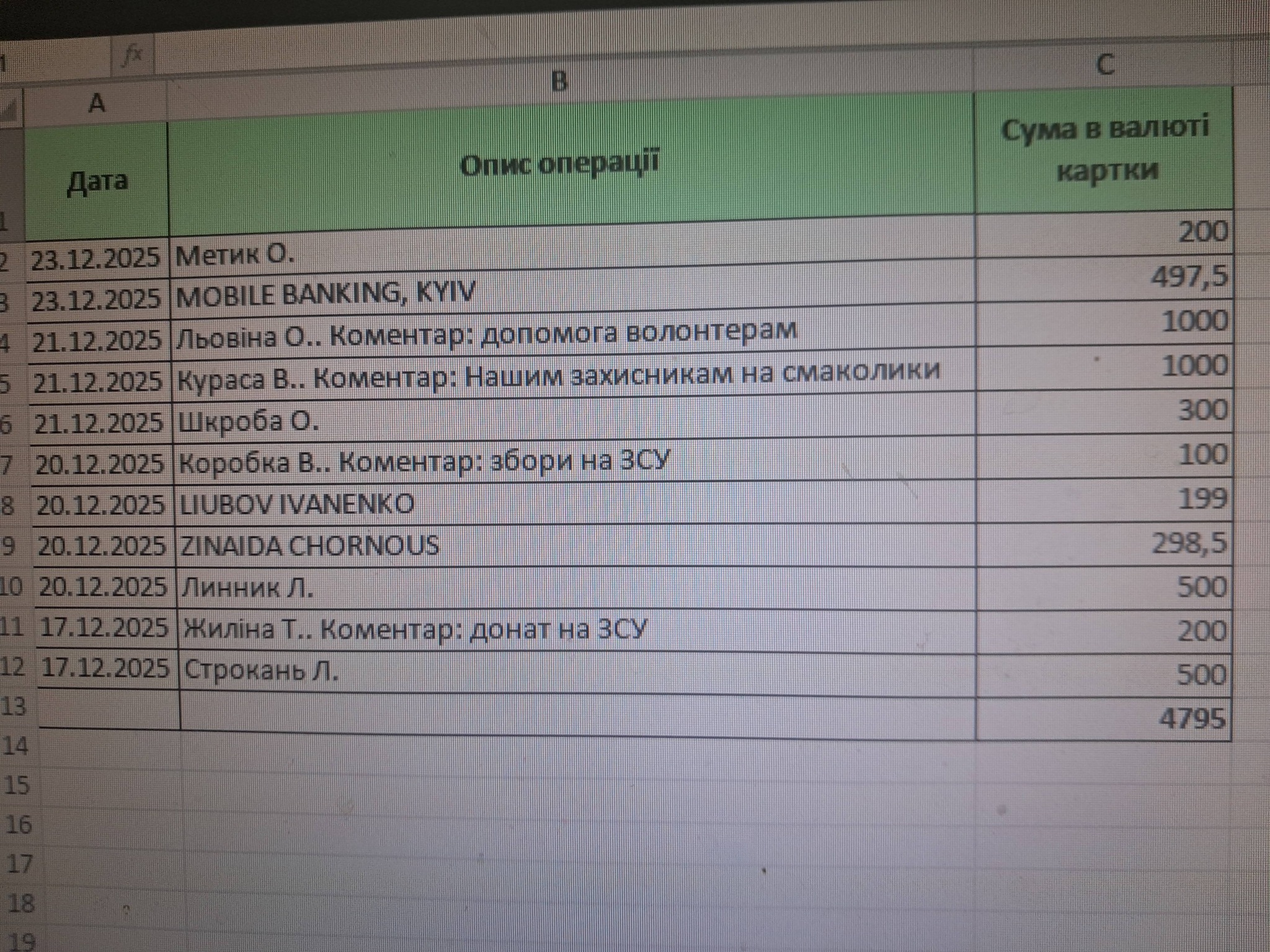 Зі Святвечором!Ще одне авто відремонтоване за Ваші донати вже виконує бойові завдання на нелегкій ділянці фронту нашим земляком Щербиною Іваном!Відремонтована КПП нашим земляком Карпенко Євгеном (неоднарозово долучається до складних ремонтів🤝),в знятті,встановленні КПП,та частковому ремонті підвіски приймали участь Івановський Сергій,Кожушко Сергій,шиномонтаж Кожушко Анатолій Романович за що велика подяка🤝🤝🤝!Ремонт КПП(запчастини)9800гр.,ремонт підвіски(запчастини)8300гр.,шини 215/65/16 2шт по 3400гр.,зазвичай практично регулярно одна шина за рахунок Костенка Івана Михайловича (с.Воронівка).Готівкою:Кравець Лідія Каністратовна (мама зниклого безвісти Юри)1000гр.,Кравець Володимер 2500гр.,Шиян Наташа 2500гр.,Гуденко Сергій(батько загиблого Саші с.Товста)2000гр.,Небайдужі жіночки 1000гр.,Карпенко Іван 500гр.разом готівки 9500гр.,на карту 4800гр..Підсумок:залишок з 17.12.2025 38050гр.до сьогодні ,задонатили 14300гр.,витрачено 21 500гр.(запчастини+ 1 шина).остаток на 24.12.2025 30850гр.Сім діб провів з хлопцями різних підрозділів Сил оборони України,отримав дуже багато запитів особливо з питань технічного забеспечення,якщо справлюсь через пару днів знову до хлопців,взавтра поступлення матерії для маскувальних сіток зимового окрасу.Так що рослаблятися бракує часу!Ще раз з Різдвом та Святвечором!Нехай цей вечір принесе мир,тепло і злагоду у Ваші домівки а Різдвяна зірка запалить у серцях віру,надію і подарує сили для нашої омріяної Перемоги!Номера карток:5168 7427 3239 5391 та 5168 7456 1383 4453 Кожушко Валерій.