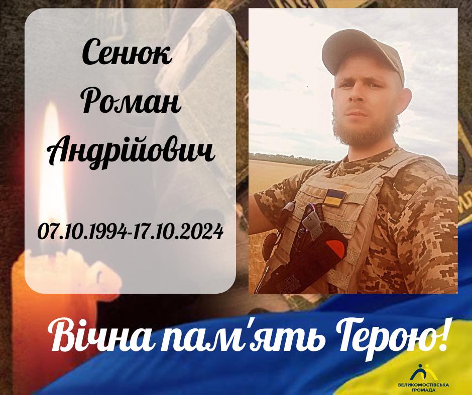 Відданий військовій присязі на вірність Українському народові, мужньо виконавши свій військовий обов’язок у боротьбі за Україну, її свободу та незалежність, загинув наш земляк — Сенюк Роман Андрійович, 1994 року народження, мешканець міста Великі Мости.