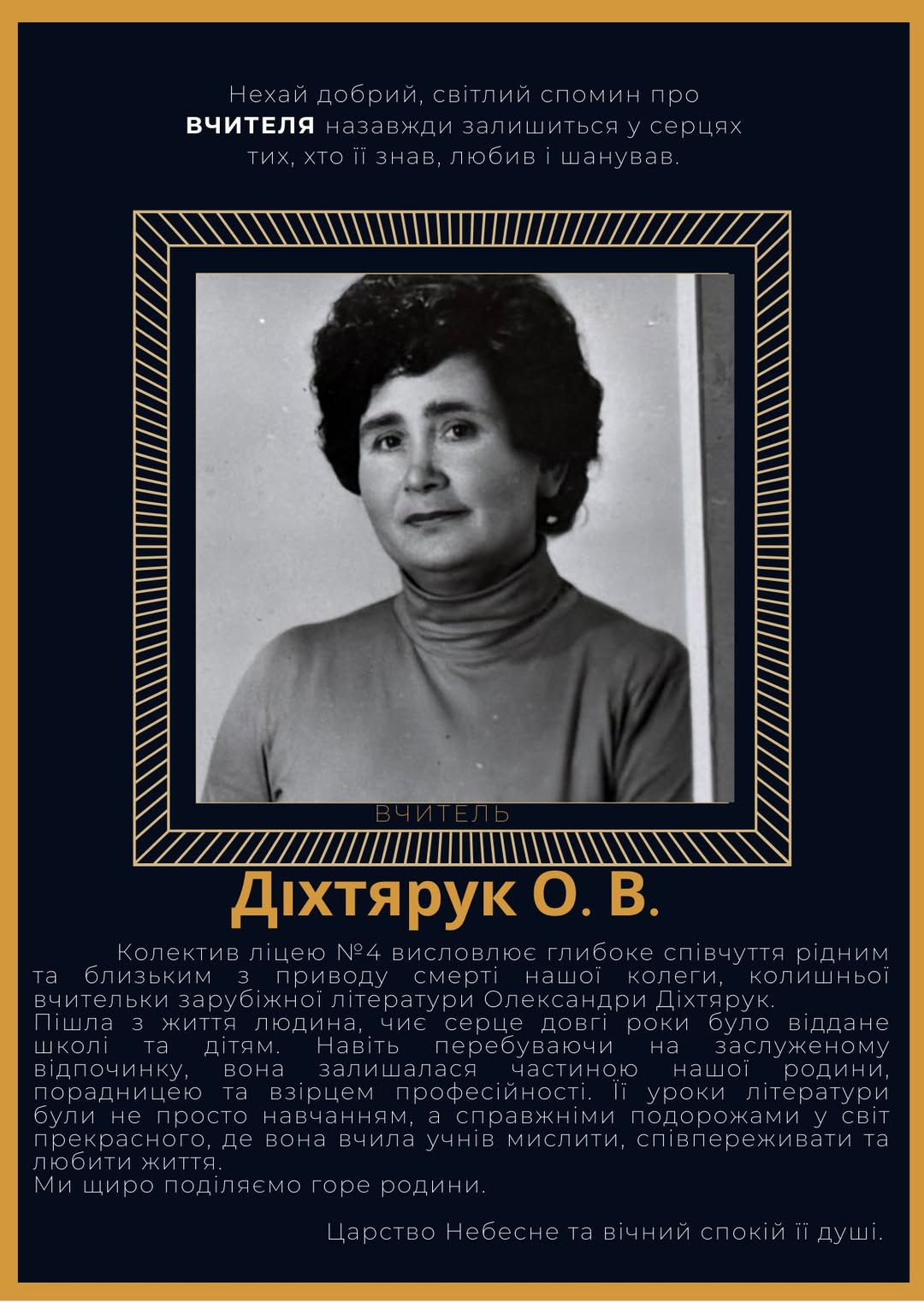 З глибоким сумом повідомляємо, що сьогодні ми проводжаємо в останню путь Діхтярук Олександру Василівну, вчительку, яка у свій час віддала багато років праці нашому навчальному закладу.