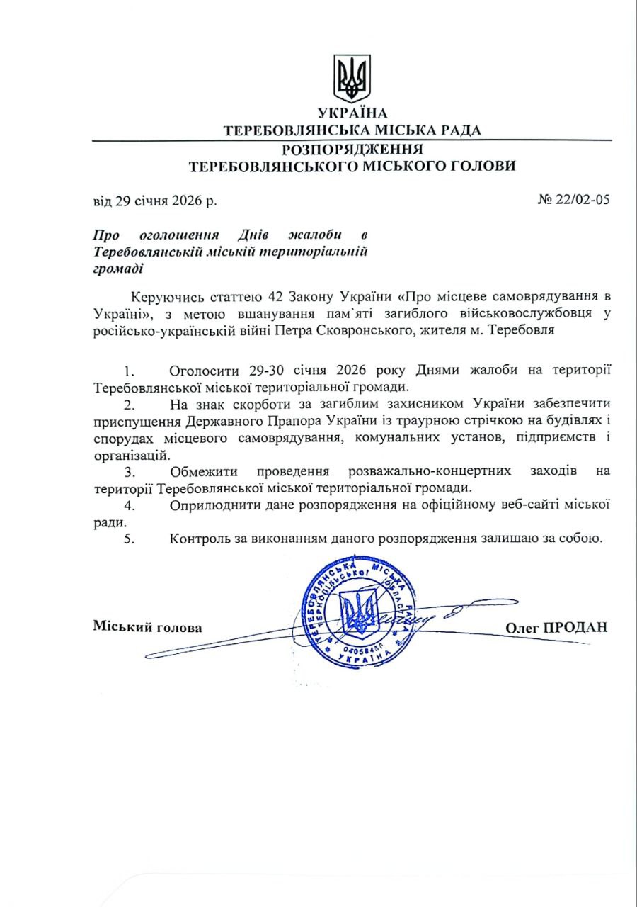 🕯️🙏З метою вшанування пам’яті загиблого військовослужбовця у російсько-українській війні жителя м. Теребовля Петра Сковронського, 29 – 30 січня 2026 року на території Теребовлянської міської територіальної громади оголошені Днями жалоби. Відповідне розпорядження видав Теребовлянський міський голова Олег Продан.
