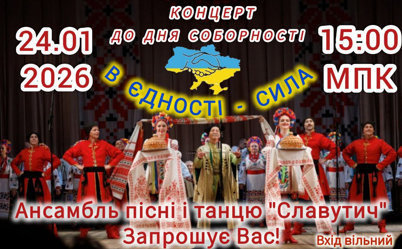 🎼 З нагоди Дня Соборності України у Міському палаці культури відбудеться благодійний концерт «В єдності — сила» за участі ансамблю пісні та танцю «Славутич». У програмі — українські пісні та танці, які зміцнюють національну єдність та відчуття спільності.