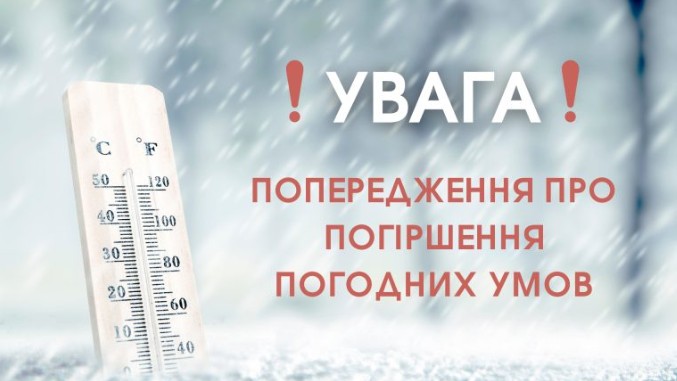 З 08.01.2026 значне погіршення погодних умов, опади у вигляді сніжно- крижаної мряки, сніг з перервами, обледеніння, пориви вітру 15-25 м/с, на дорогах ожеледиця, значне пониження температури повітря: вночі до -9-16 градусів морозу.