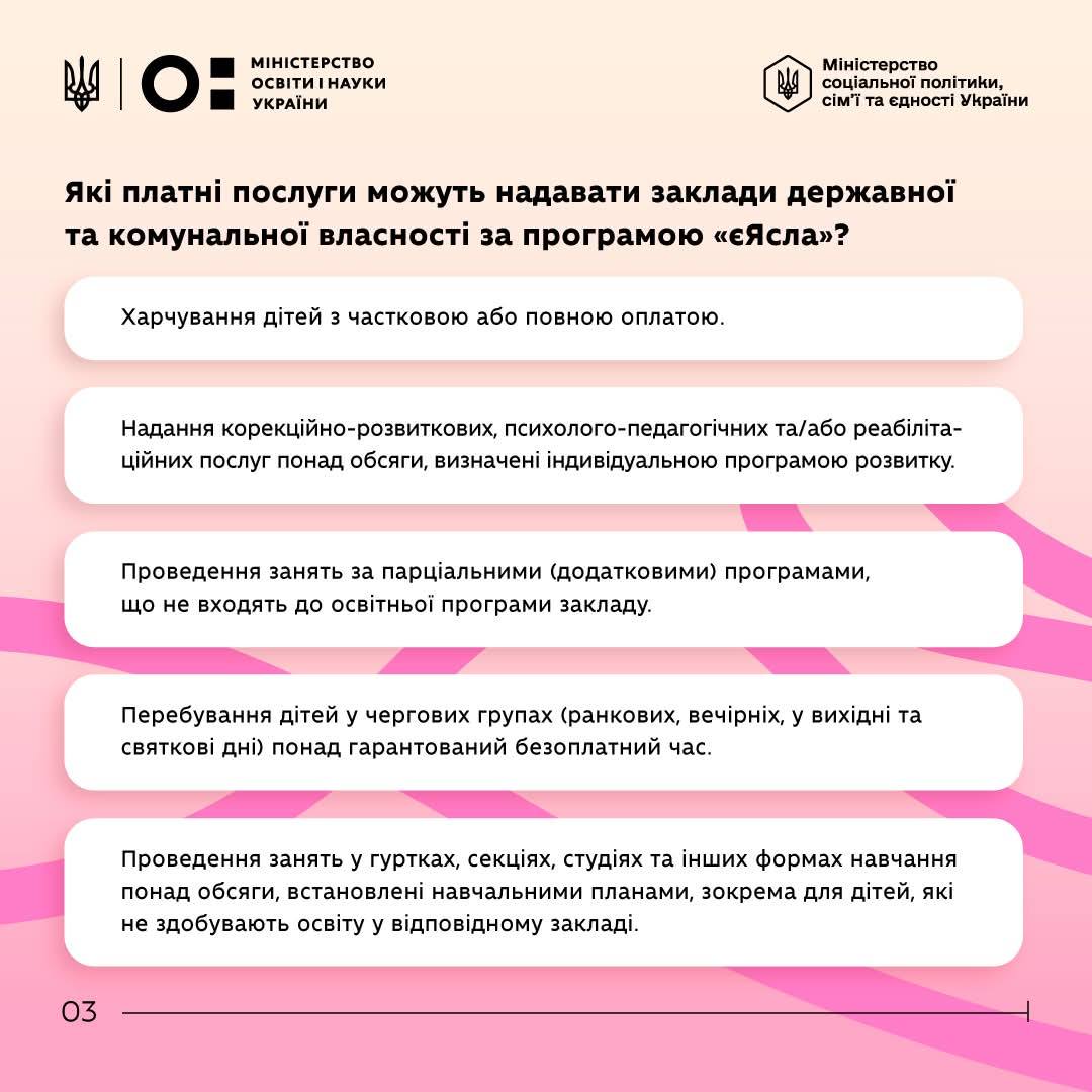 🔹 платних послуг у комунальних і державних закладах дошкільної освіти відповідно до чинного законодавства (харчування, гуртки, корекційні заняття, чергові групи тощо).