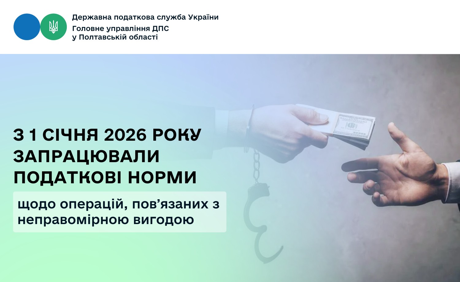 Головне управління ДПС у Полтавській області інформує, що з 1 січня 2026 року в Україні застосовуються норми Податкового кодексу України щодо виявлення та податкових наслідків операцій, пов’язаних із наданням неправомірної вигоди службовій особі, у тому числі іноземних держав.