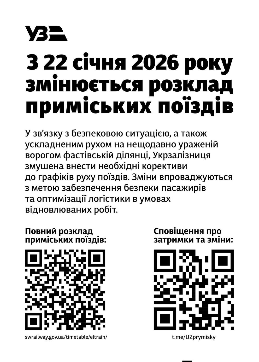 У зв’язку з безпековою ситуацією, а також ускладненим рухом на нещодавно ураженій ворогом фастівській ділянці, Укрзалізниця – Ukrzaliznytsia змушена внести необхідні корективи до графіків руху поїздів. Зміни впроваджуються з метою забезпечення безпеки пасажирів та оптимізації логістики в умовах відновлюваних робіт.