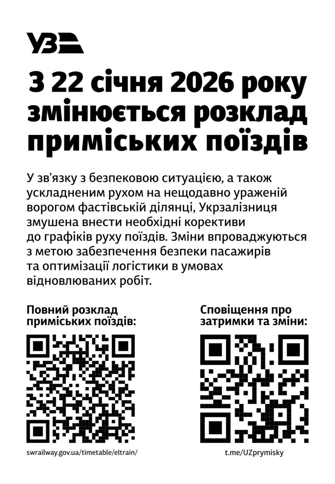 У зв’язку з безпековою ситуацією, а також ускладненим рухом на нещодавно ураженій ворогом фастівській ділянці, Укрзалізниця – Ukrzaliznytsia змушена внести необхідні корективи до графіків руху поїздів. Зміни впроваджуються з метою забезпечення безпеки пасажирів та оптимізації логістики в умовах відновлюваних робіт.
