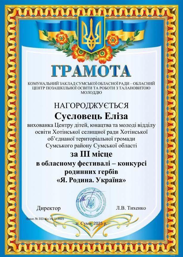 Щиро вітаємо з призовим місцем в обласному фестивалі-конкурсі родинних гербів “Я. Родина. Україна.” Сусловець Елізу!