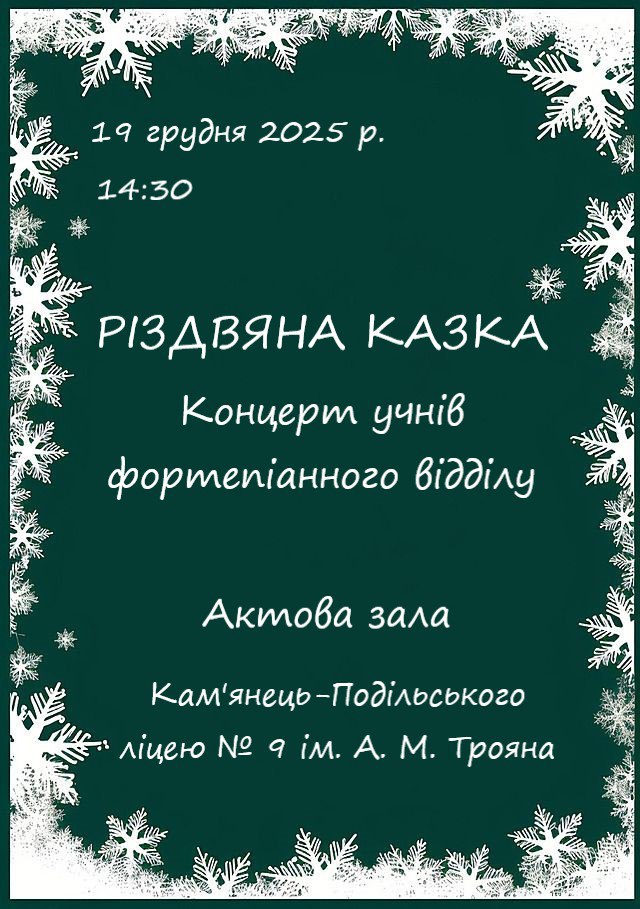 У виконанні талановитих учнів прозвучать твори сучасних композиторів, що створять особливий настрій зимового дива. «Різдвяна казка» — це нагода підтримати юних музикантів і разом відчути чарівність прийдешніх свят.