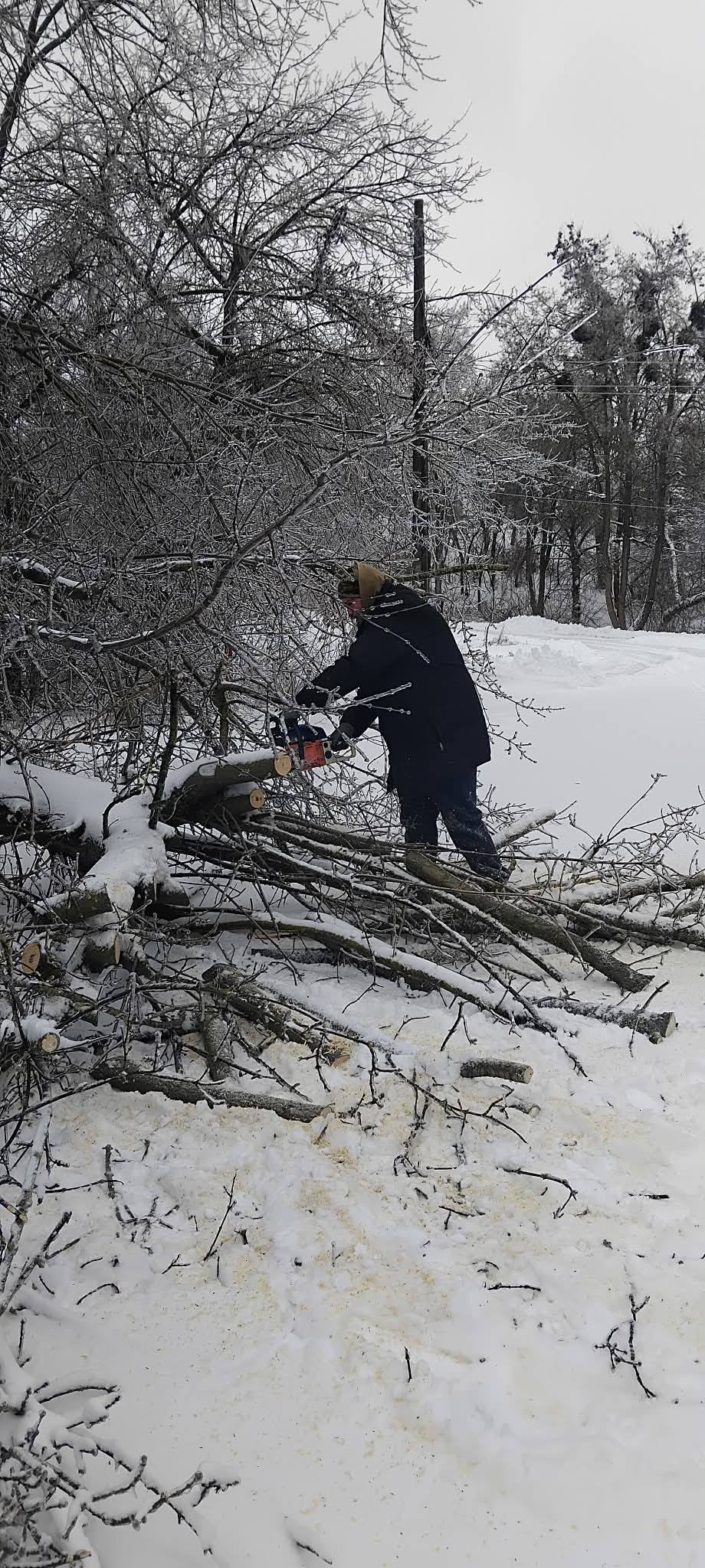 ✔️Дібрівка: розчищали дороги трактором, вручну чистили тротуари і автобусні зупинки, посипали сумішшю від ожеледиці, рубали дрова для обігріву приміщень старостату і пошти