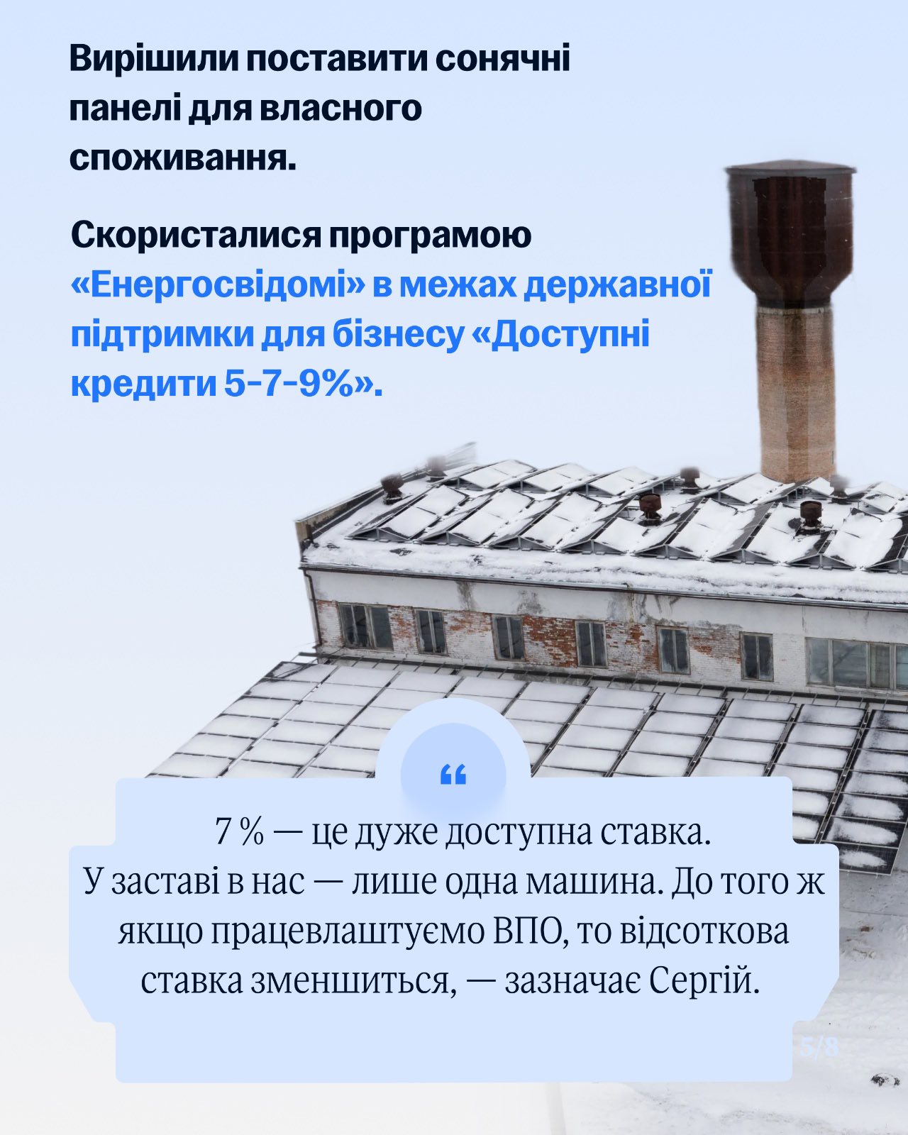 – Власники бізнесу можуть отримати позику на суму до 150 млн грн строком до 10 років. Кредитні кошти можна використати не тільки на купівлю сонячних панелей, а також на вітрові установки, системи для зберігання енергії, газопоршневі, газотурбінні та біогазові генераційні установки тощо, – додала посадовиця.