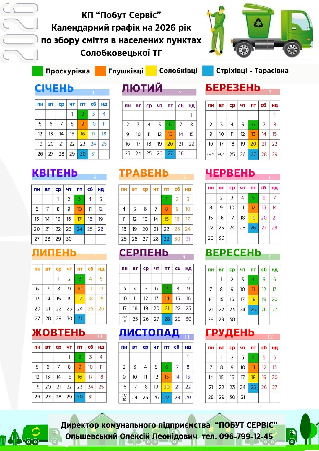 У 2026 році збір твердих побутових відходів на території громади здійснюється згідно з установленим графіком. Комунальне підприємство працює у штатному режимі.