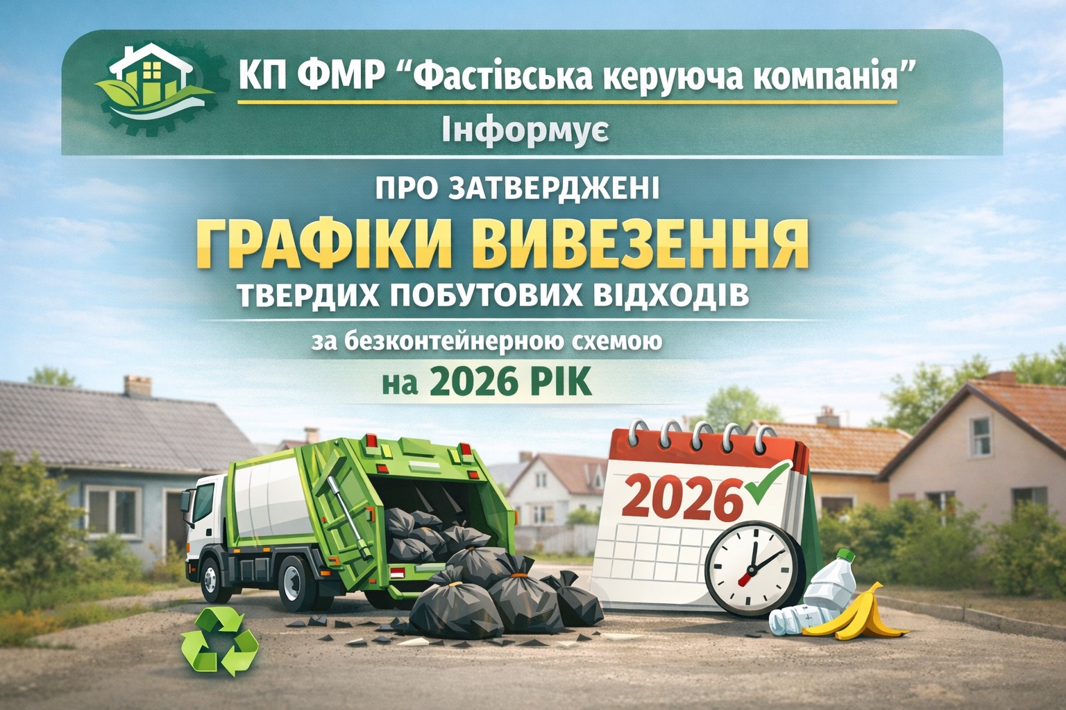 ♻️ КП ФМР «Фастівська керуюча компанія» інформує про затверджені графіки вивезення твердих побутових відходів за безконтейнерною схемою на 2026 рік.