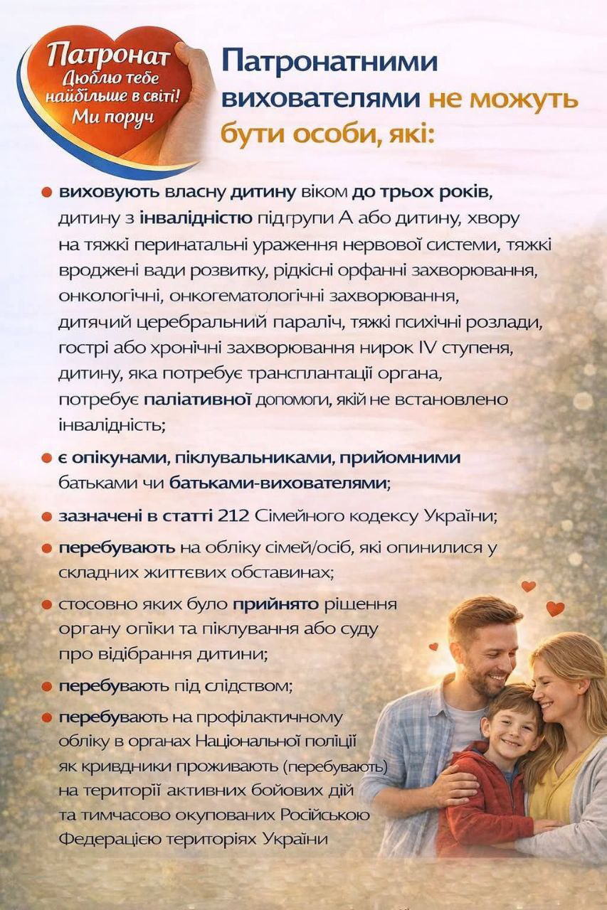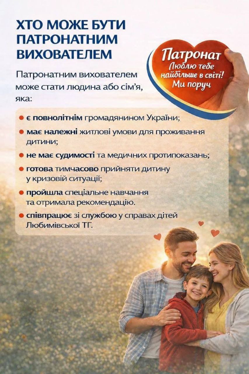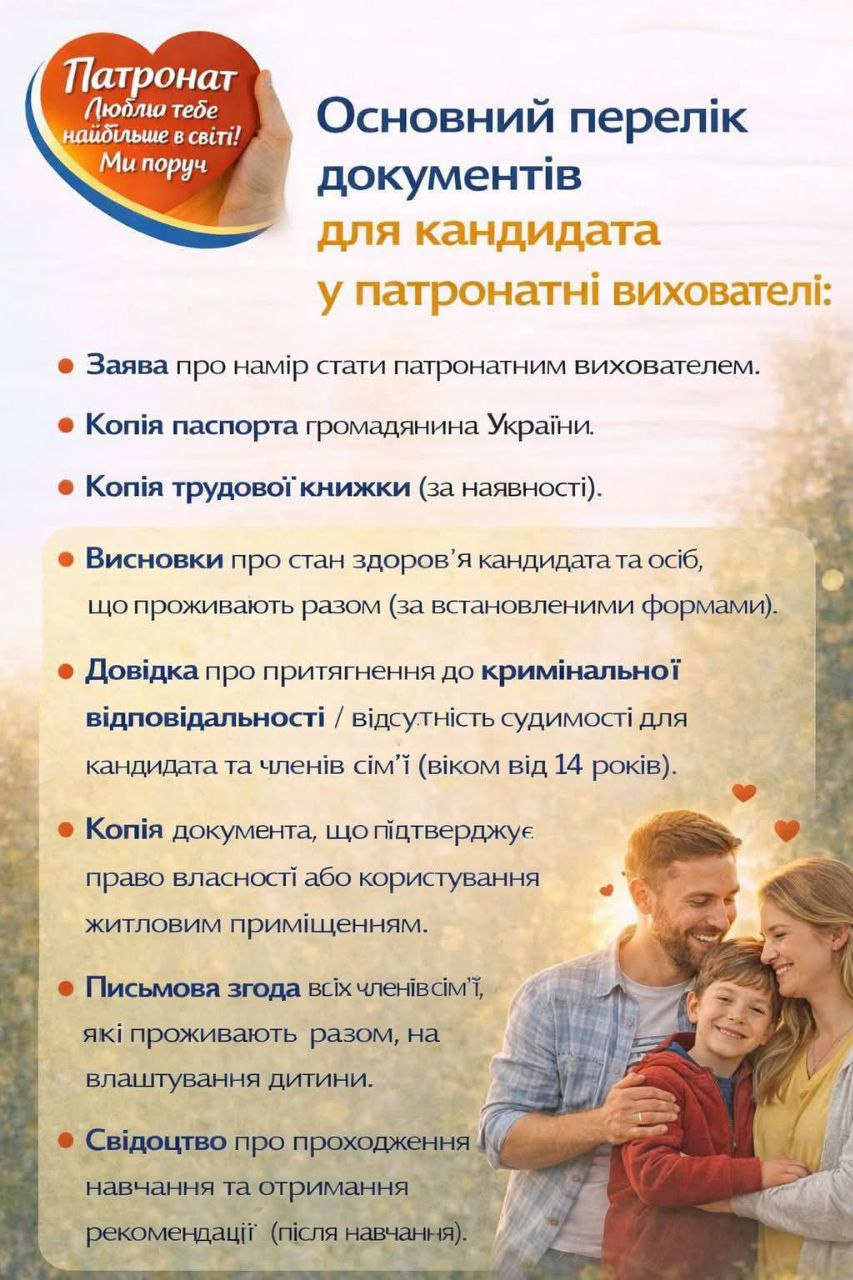 ПАТРОНАТНА РОДИНА — це тимчасова сім’я, яка приймає дитину, яка опинилася у кризовій або небезпечній для неї ситуації, щоб забезпечити їй безпечне середовище та належний догляд до відновлення умов у рідній родині або до влаштування дитини в іншу сім’ю. Патронатні батьки виконують функцію тимчасових опікунів: вони піклуються про здоров’я, освіту, емоційний розвиток і безпеку дитини, підтримують її стабільність і соціалізацію. Така форма виховання дає дитині відчуття захищеності, уваги та любові в період складних життєвих обставин, а також допомагає сім’ї, з якої дитина походить, подолати кризу і зберегти родинні зв’язки.