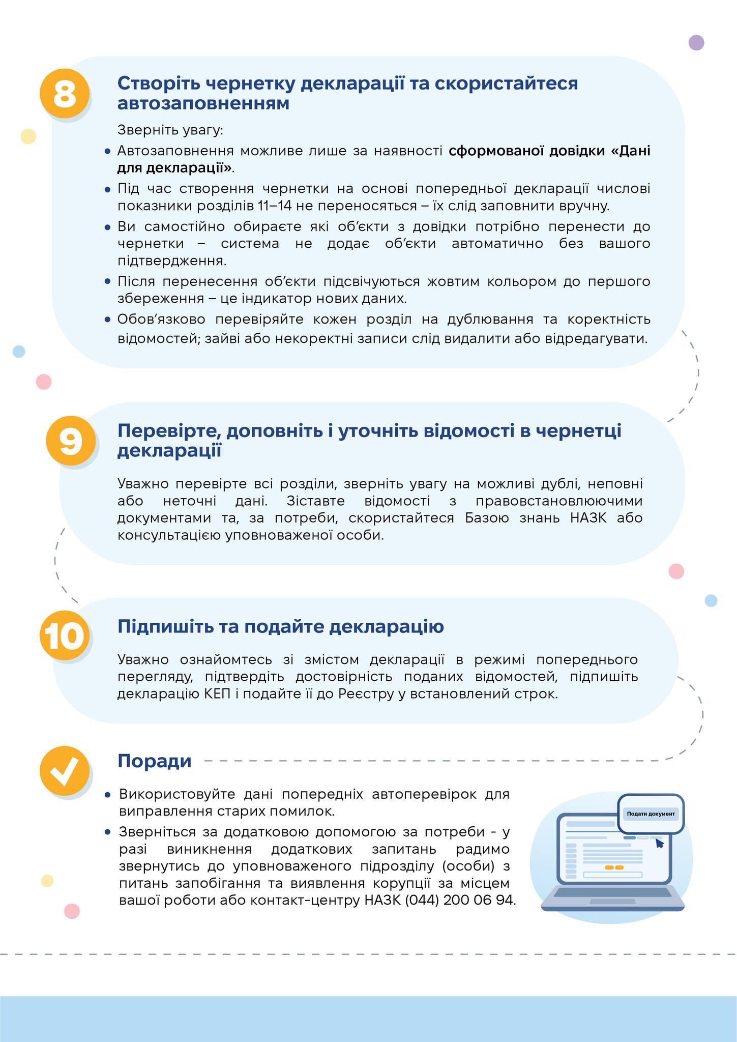 Ця покрокова інструкція допоможе вам структурувати процес та ефективно використати цифрові інструменти НАЗК, зокрема Автозаповнення чернетки декларації.