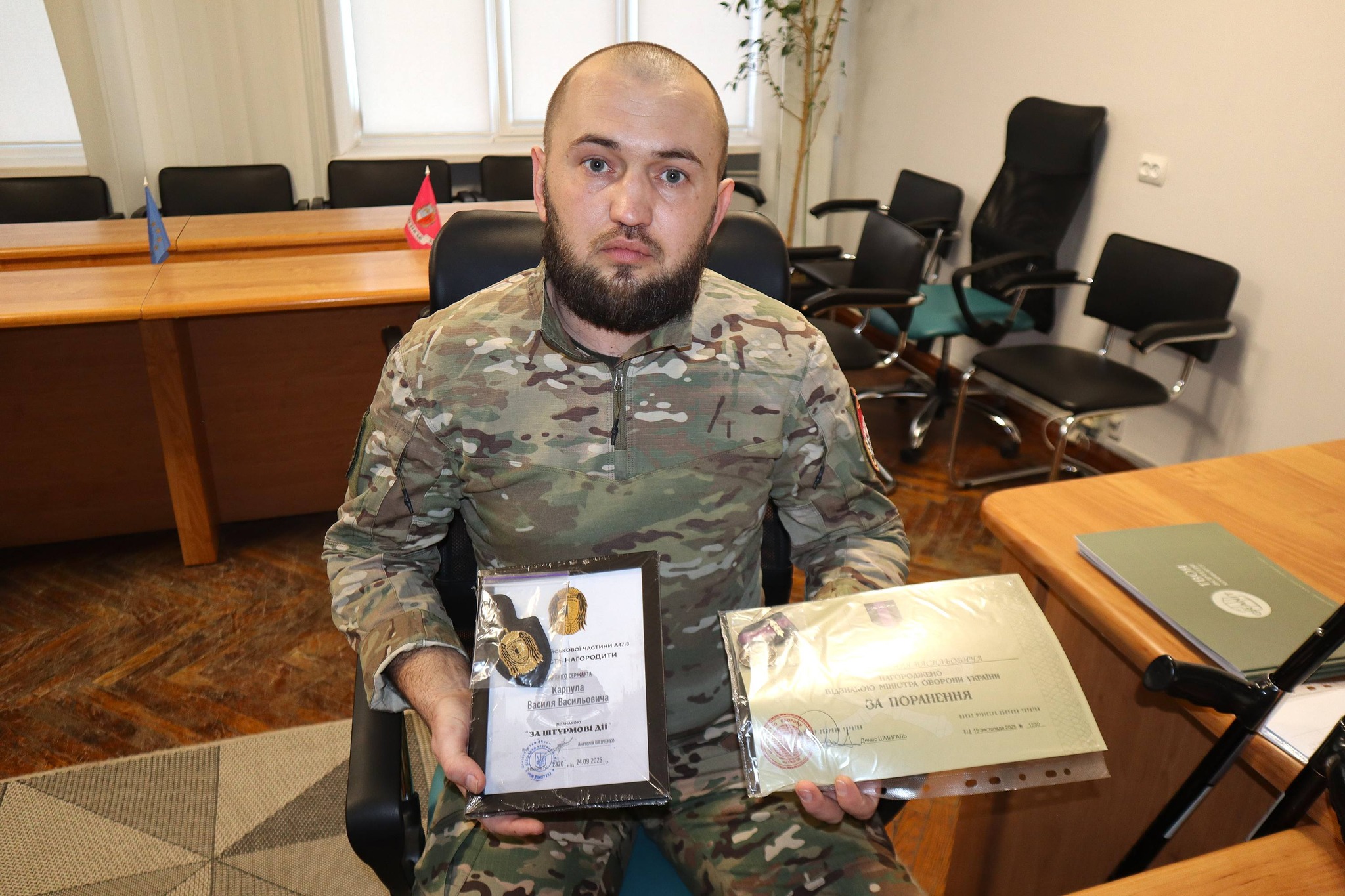 🔹 Відзнаку “За штурмові дії” та безпосередню участь у виконанні бойових завдань, яку передав командир військової частини А4718 Анатолій Шевченко;