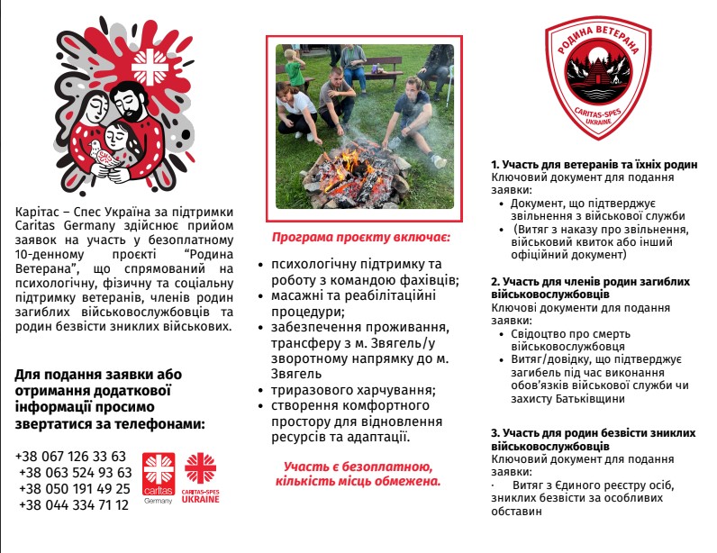 📢Карітас – Спес Україна за підтримки Caritas Germany здійснює прийом заявок на участь у безоплатному 10-денному проєкті “Родина Ветерана”, що спрямований на психологічну, фізичну та соціальну підтримку ветеранів, членів родин загиблих військовослужбовців та родин безвісти зниклих військових.